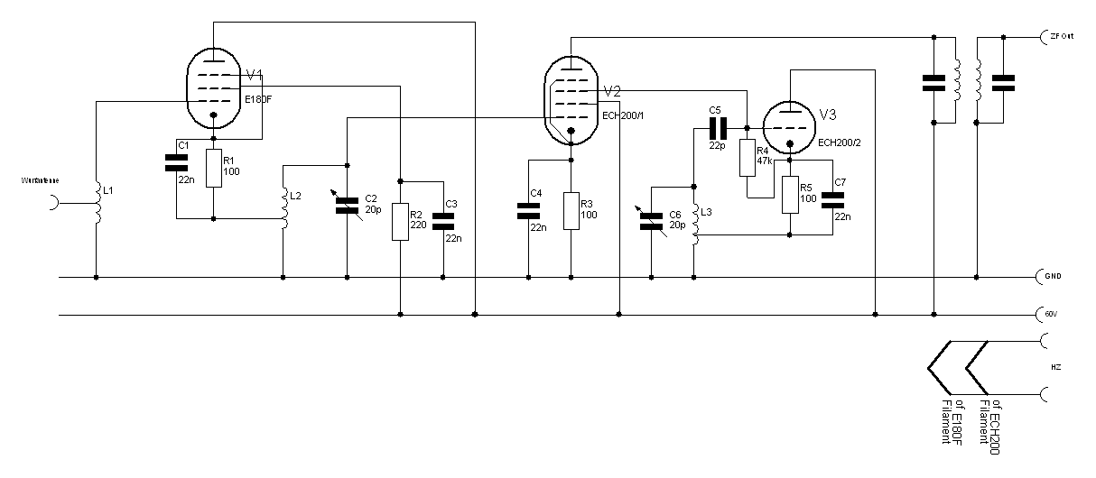 Der Oszillator wird mit der Triode der ECH200 in Hartley Schaltung gebildet.